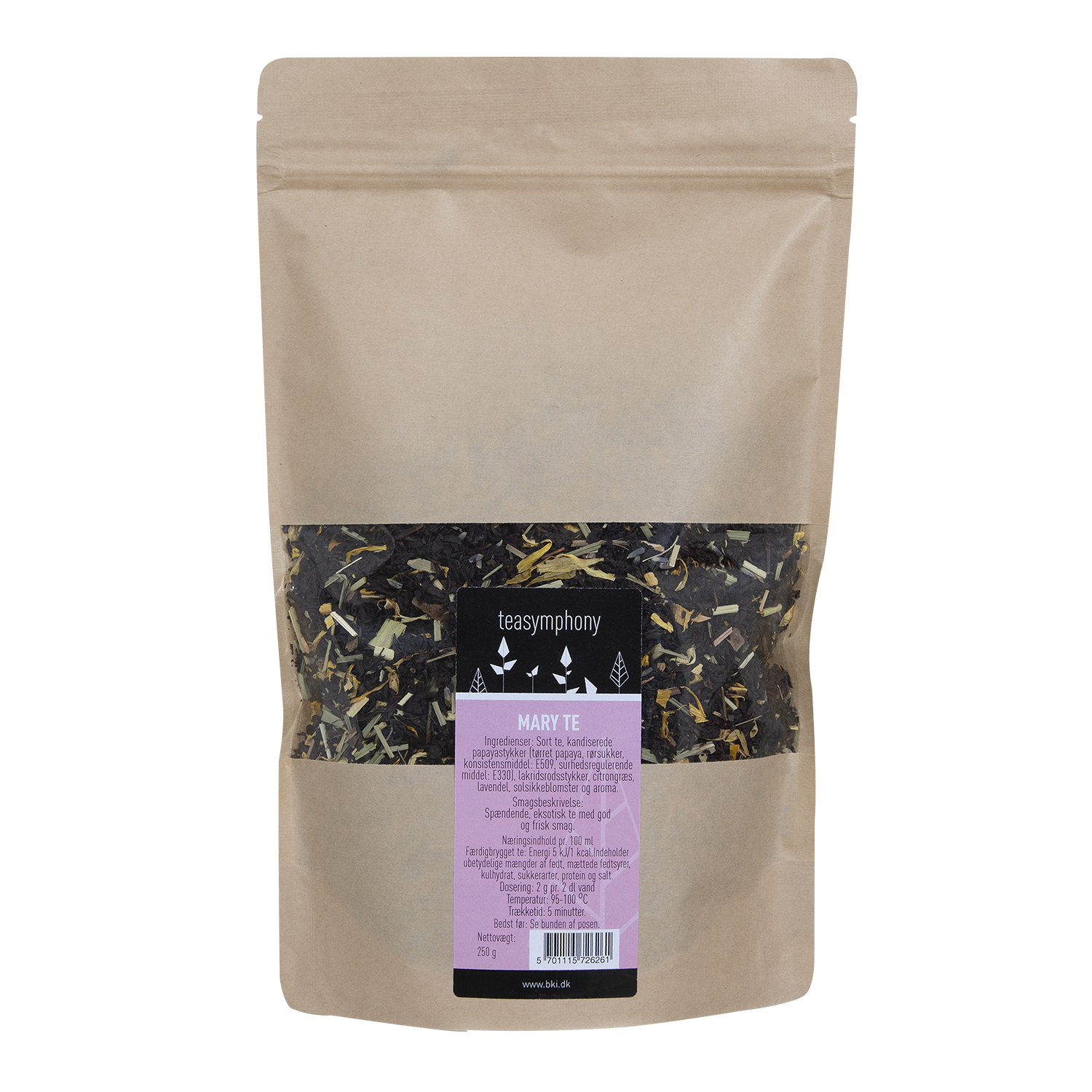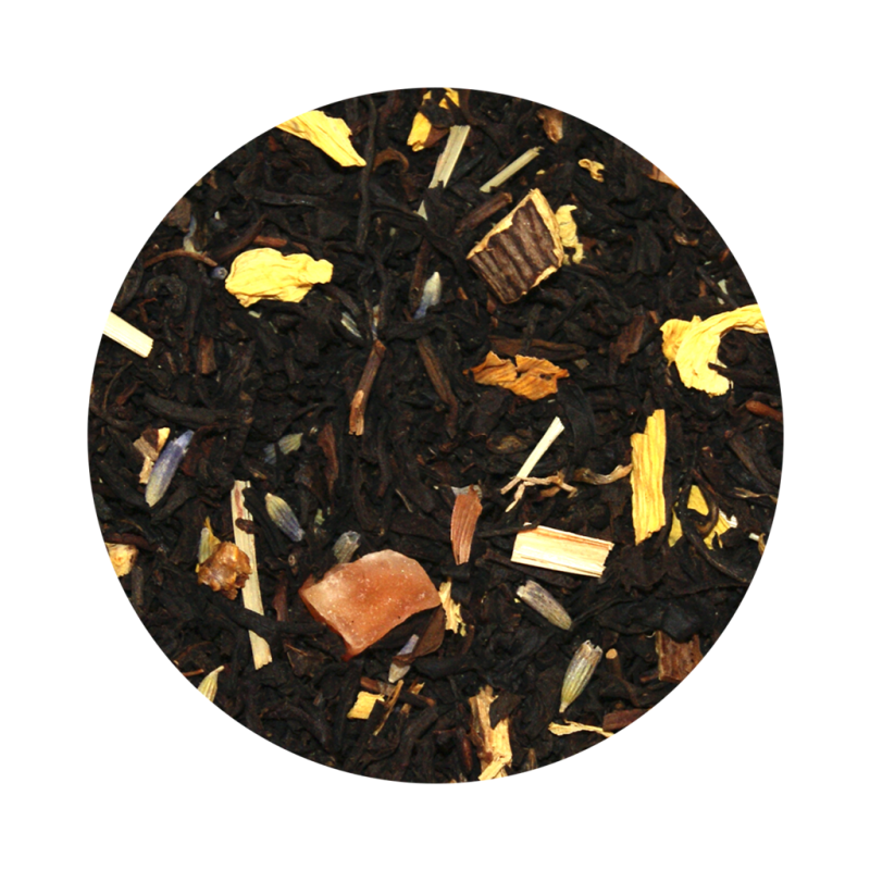 Sort te, kandiserede papayastykker (tørret papaya, rørsukker, konsistensmiddel: E509, surhedsregulerende middel: E330), lakridsrodsstykker, citrongræs, lavendel, solsikkeblomster og aroma.