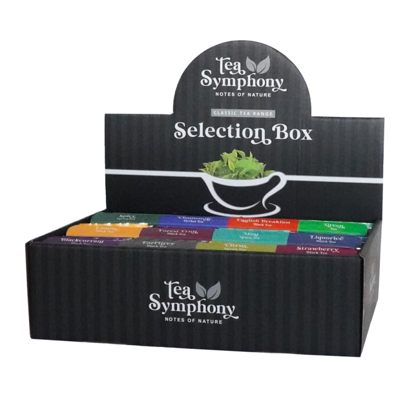 - Tea Symphony Selection Box med 180 tebreve fordelt på 12 forskellige smagsvarianter. Al grøn og sort te er 100% Rainforest Alliance certificeret og æsken udformet i FSC materialer. Mint Green Tea Green Tea Citrus green Tea Spicy Green Tea Blackcurrent English Breakfast Lemon, Earl Grey Forest Fruit Strawberry Chaomile Liquorice