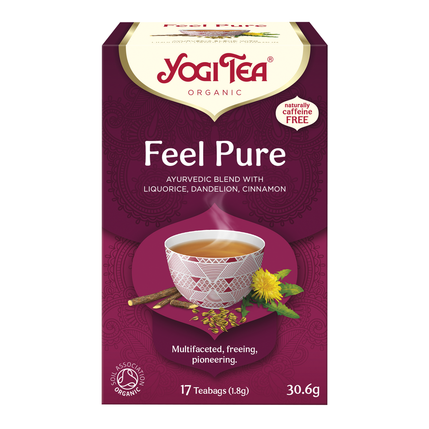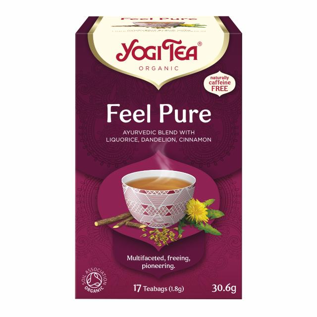 - En lækker ayurvedisk urteteblanding med lakrids, mælkebøtte, kanel, som skal nydes af alle, der ønsker en frisk start. Et vigtigt skridt i retningen mod større balance er at vende sig mod de ting, der er gode for os, og give slip på de ting, der tynger os. Med sin afbalancerede blanding af urter og krydderier som lakrids, ingefær og mælkebøtte er YOGI TEA® Feel Pure den perfekte følgesvend på denne vidunderlige rejse.