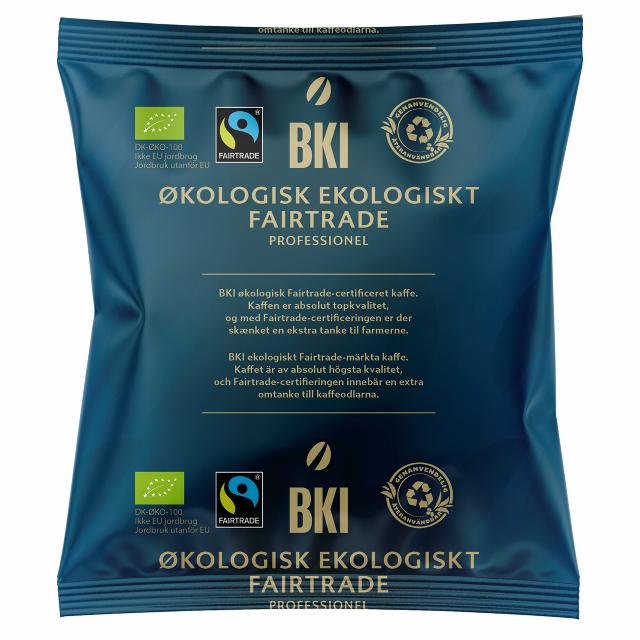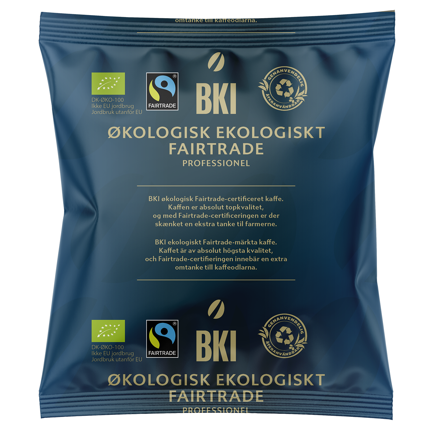 - BKI var et af de første risterier i Danmark, der lancerede økologisk kaffe i starten af 1990’erne. Vi stiller høje krav til vores økologiske kaffe og er derfor altid på udkig efter kvaliteter, der efterlever disse krav. Ved at have økologiske produkter i vores sortiment giver vi forbrugerne mulighed for at vælge produkter, som fremmer et bedre miljø. Fairtrade-mærket er en international mærkningsordning, som betyder, at kaffebonden i Afrika, Asien og Syd- og Mellemamerika garanteres en mindstepris for sine produkter. Målet er, gennem fair handel, at forbedre arbejds- og levevilkårene for bønder og arbejdere. Hensyntagen til miljøet er også en del af Fairtrade-programmet. Denne kaffe bliver leveret i Danmarks første genanvendelige kaffepose i plast, som efter brug kan blive til nye plastprodukter, når den sorteres som "blød plast".