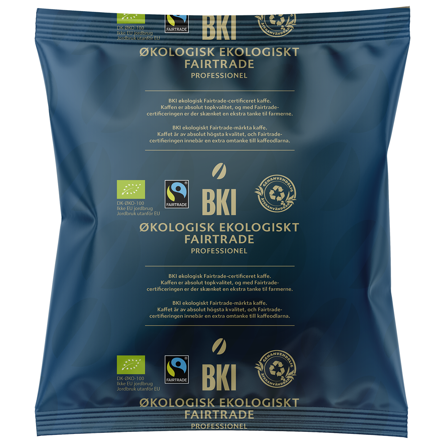 - BKI var et af de første risterier i Danmark, der lancerede økologisk kaffe i starten af 1990’erne. Vi stiller høje krav til vores økologiske kaffe og er derfor altid på udkig efter kvaliteter, der efterlever disse krav. Ved at have økologiske produkter i vores sortiment giver vi forbrugerne mulighed for at vælge produkter, som fremmer et bedre miljø. Fairtrade-mærket er en international mærkningsordning, som betyder, at kaffebonden i Afrika, Asien og Syd- og Mellemamerika garanteres en mindstepris for sine produkter. Målet er, gennem fair handel, at forbedre arbejds- og levevilkårene for bønder og arbejdere. Hensyntagen til miljøet er også en del af Fairtrade-programmet. Denne kaffe bliver leveret i Danmarks første genanvendelige kaffepose i plast, som efter brug kan blive til nye plastprodukter, når den sorteres som "blød plast".