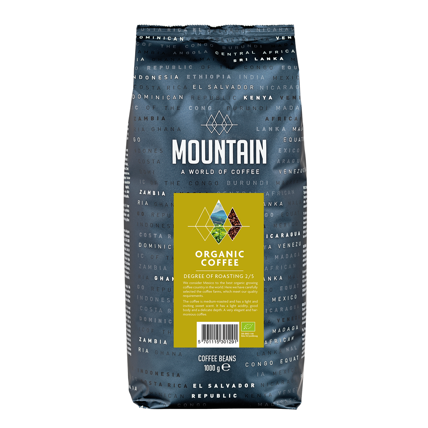 - Mountain kaffe er en serie af hele bønner. Vi har også kaffer, der er økologiske eller Fairtrade-mærkede - eller begge dele. Det er kaffer af meget høj kvalitet, og de smager bestemt ikke ringere, når man tænker på de gode ideer og initiativer, der ligger bag produkterne. Denne kaffe bliver leveret i en kaffepose af plast, udviklet til at kunne genanvendes, når den sorteres som "blød plast".