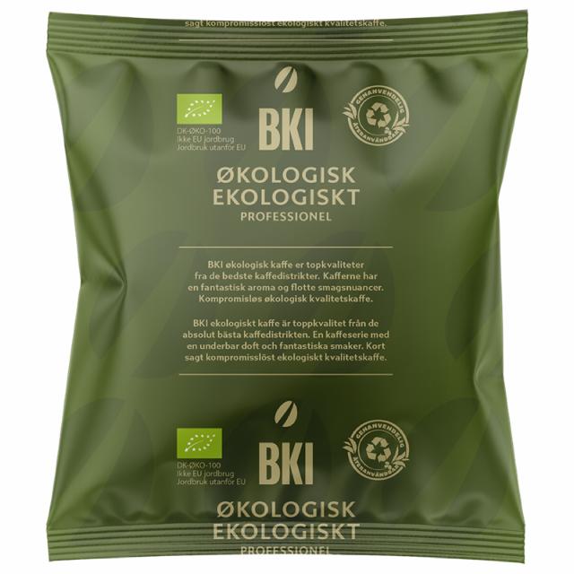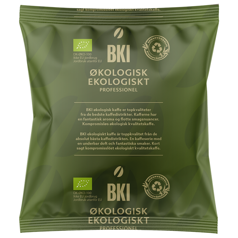 - BKI økologisk kaffe er topkvaliteter fra de bedste kaffedistrikter. Kaffen har en fantastisk aroma og flotte smagsnuancer. De økologiske kaffevarianter er det perfekte match i stempelkander, kandebryg og bryganlæg. Denne kaffe bliver leveret i Danmarks første genanvendelige kaffepose i plast, som efter brug kan blive til nye plastprodukter, når den sorteres som "blød plast".