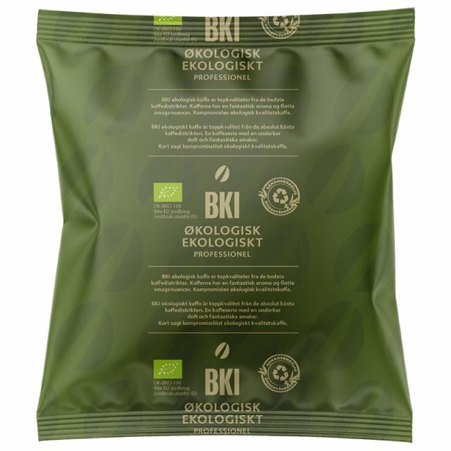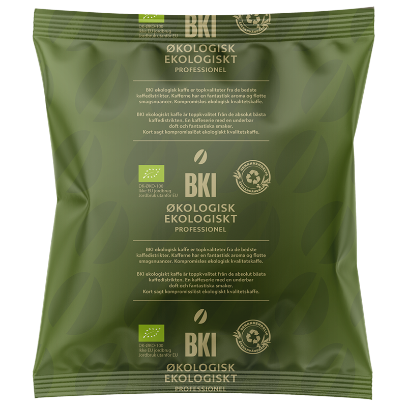 - BKI økologisk kaffe er topkvaliteter fra de bedste kaffedistrikter. Kaffen har en fantastisk aroma og flotte smagsnuancer. De økologiske kaffevarianter er det perfekte match i stempelkander, kandebryg og bryganlæg. Denne kaffe bliver leveret i Danmarks første genanvendelige kaffepose i plast, som efter brug kan blive til nye plastprodukter, når den sorteres som "blød plast".