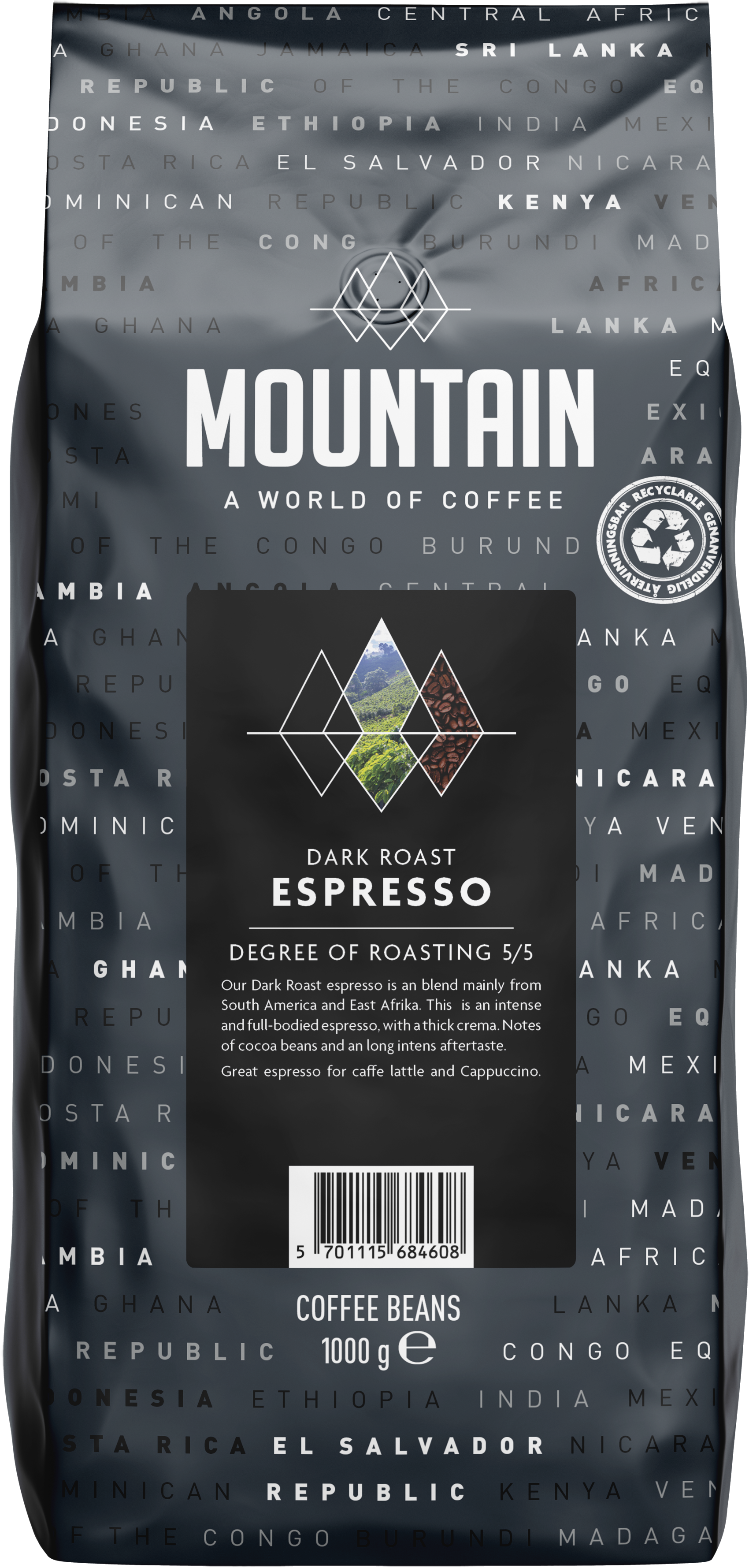 - Mountain kaffe er en serie af hele bønner. Vores varesortiment består af rene kaffer, blandingskaffer og smagskaffer. Vi har en kaffe fra - næsten - alle kaffedyrkende områder i verden. Bønner leveres i 1 kg vakuumposer med ventil. Denne ventil betyder, at de nyristede bønner kan pakkes kort tid efter ristning, og at den fulde smag og aroma dermed bibeholdes. Ventilposen giver bønnerne en holdbarhed på et år.