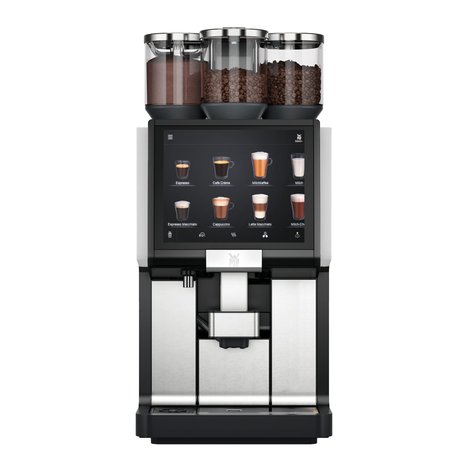- WMF 5000S+ Basic 4 (400V) med 2 kaffebønnebeholdere, kakao, frisk mælk og Autoclean. Her taler vi Premium maskine der brygger i barista kvalitet. Med 2 kaffebønnebeholdere til hele og espressobønner og 1 instantbeholder til kakao. Maskinen er med WMF’s unikke Dynamic friskmælk system (varm mælk, kold mælk, steamet varm mælkeskum og kold mælkeskum). Maskinen tilbyder et bredt udvalg af lækre kaffespecialiteter samt kakao. Med WMF’s banebrydende AutoClean system slipper du for manuelt at håndtere den daglige rengøring. Programmet indstilles blot én gang, hvorefter det kører automatisk, når det passer ind i jeres daglige rutine. Du skal kun sørge for at påfylde renseprodukter til hhv. mælke- og kaffesystem.