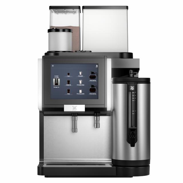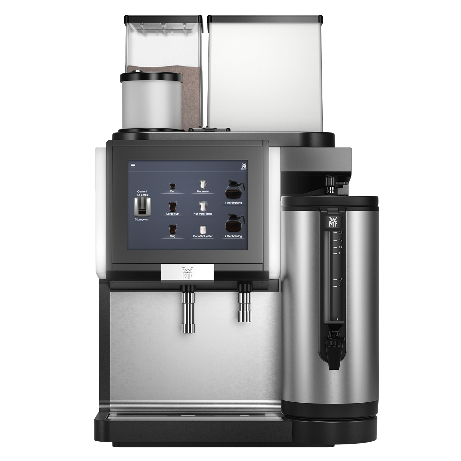 WMF 9000F sikrer den bedste kvalitet til storkøkkener, hoteller og lufthavne. Denne fuldautomatiske kaffebrygger er perfekt til morgenbuffeten og til konferenceservering. Den integrerede 4 liters kaffebeholder kan indstilles til en brygningsmængde på en 1,2 eller 4 liter. Der kan også defineres en max opbevaringsperiode ligesom det også er muligt at definere, om der skal brygges mere kaffe, når beholderen er tømt. Denne model af WMF 9000F kan hurtigt brygge 50 liter kaffe, svarende til 500 kopper pr. time. Maskinen kan indstilles til automatisk at brygge et givent antal liter kaffe i faste tidsintervaller. Let automatisk rengøring: Dispenseren til rengøringsmidlet gør det muligt at indstille kaffemaskinen til at starte den automatiske rengøringsproces på et ønsket tidspunkt. Denne unikke funktion gør at rengøringen er nem og meget effektiv. Maskinen gør selv arbejdet.