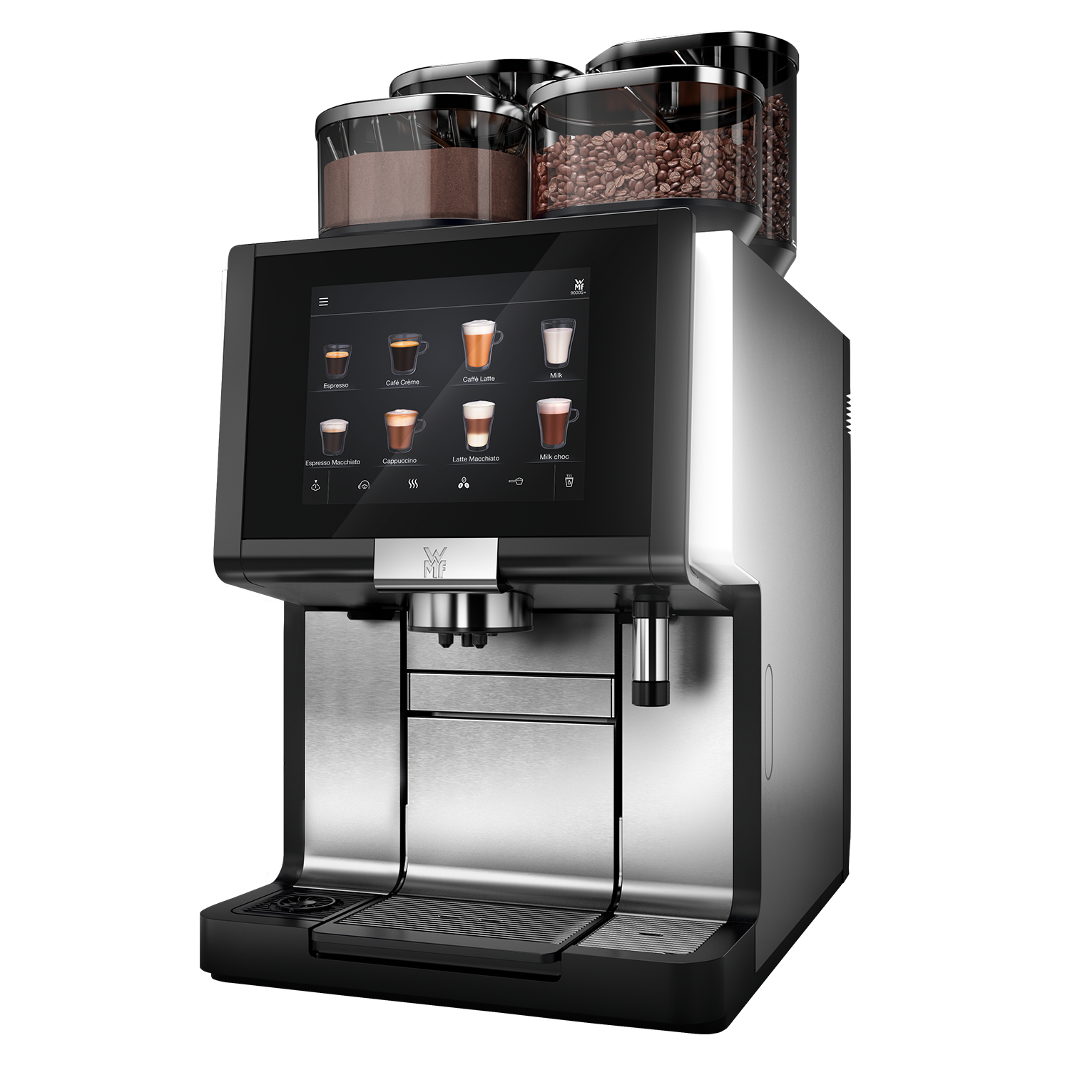 - WMF 9000S+ er premium maskinen, der leverer hastighed til perfektion. Med et stort udvalg af drikke leverer den hurtigt og uden at gå på kompromis med kvaliteten og baristaoplevelsen. Den har en anbefalet kapacitet på minimum 350 kopper om dagen. 9000S+ er kaffemaskinen, der dækker den store efterspørgelse. Med op til fire bønnebeholdere til hele- og espressobønner samt kakao er udvalget uendeligt, ligesom maskinen tilbyder kaffespecialiteter med frisk mælk. Med brug af den smarte og brugervenlige 10" touchskærm kan enhver vælge lækre kaffe- og chokoladespecialiteter. WMF 9000S+ er støjsvag, og de unikke kværne sikrer en fast høj baristakvalitet og en perfekt kop kaffe hver gang. Med den patenterede SteamJet kan kop eller glas forvarmes, inden den ønskede kaffedrik brygges. Den daglige rengøringsproces af maskinen er hurtig og nem ved brug af den unikke rengøringsfunktion. 9000S+ fås i flere udgaver med en eller to kværne til hele- og espressobønner, frisk mælk eller mælketopping/kakao og separat hane til tevand. Maskinen er en højtydende 400 V model, hvor der er mulighed for samtidig brygning af kaffe og tevand. Maskinen findes med det unikke Dynamic Milk system. Mulighed for køleskab under bord og mulighed for valg af to typer mælk. Touchskræmen kan vise billeder og videoer efter ønske. WMF 9000S+ kan leveres med individuelle ønsker som f.eks. Dynamic Coffee Assist, Dynamic Milk Assist, Fresh Filtered Coffee, sirup station og chilled coffee. Som standard har den WMF connect.