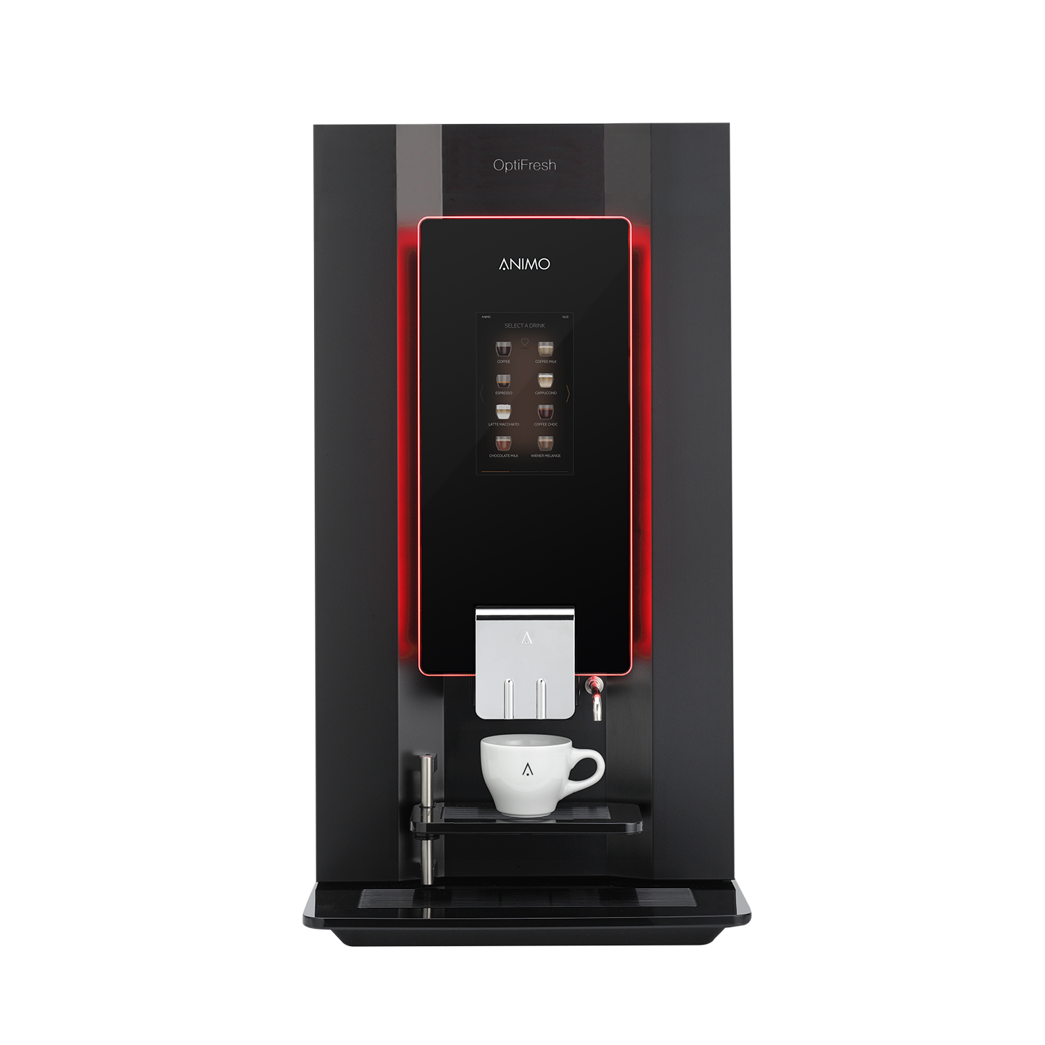 - Animo producerer avancerede kaffeautomater i et yderst moderne design, der bliver bemærket. Alle maskiner fra Animo brygger kaffe af premium kvalitet, er meget brugervenlige og slidstærke. Kort sagt; det oplagte valg til virksomheder, hvor der ikke gås på kompromis med noget som helst. Den lækreste kaffe serveret af maskine i eksklusivt design. Animo Optifresh imødekommer vores kræsne kunders ønsker og behov – både i forhold til kaffekvalitet, design, miljø og brugervenlighed. Maskinen serverer et bredt udvalg af friskbryggede drikke. Helt kort friskbrygget kaffe, nem at betjene og rengøre, kopregistrering så brygningen først begynder, når koppen er placeret korrekt, meget energieffektiv, let at installere, passer ind de fleste steder og er en yderst stabil model. Maskinen har 2 instantbeholdere og leveres med Touchskærm