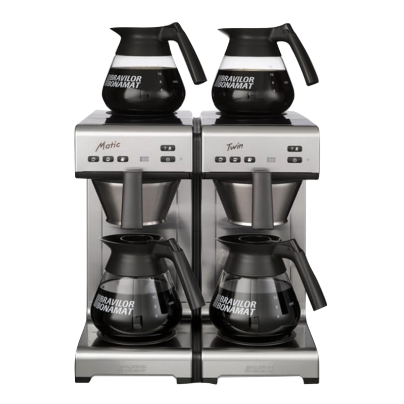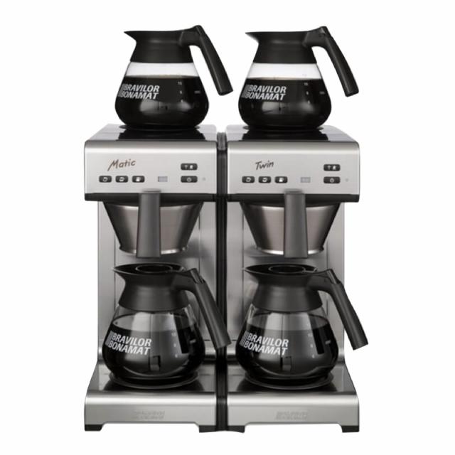 - Denne model er med fast vandtilslutning, så du ikke behøver at fylde maskinen med vand - den doserer selv den rette mængde afhængigt af den kaffemængde, du har valgt at brygge. Maskinen leveres med i alt fire glaskander, så du på blot 12 minutter kan brygge 4 kander kaffe. Varmepladen på toppen holder den bryggede kaffe varm, mens de sidste to kander brygges. På fronten af hver bryggestation på Bonamat Matic Twin finder du fem knapper til at styre stationen med - 1 tænd/sluk knap, 3 knapper til at bestemme mængden af kaffe, samt en til at tænde for varmepladen på toppen af maskinen. Når brygningen er færdig lyder et signal fra maskinen, så du ved hvornår, der er friskbrygget kaffe på kanden.