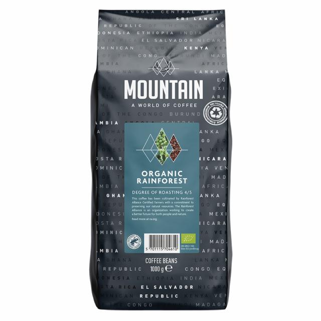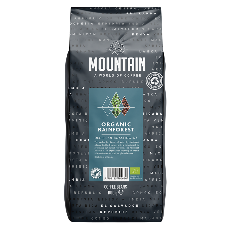- Mountain kaffe er en serie af hele bønner. Vi har også kaffer, der er økologiske eller Fairtrade-mærkede - eller begge dele. Det er kaffer af meget høj kvalitet, og de smager bestemt ikke ringere, når man tænker på de gode ideer og initiativer, der ligger bag produkterne. Denne kaffe bliver leveret i en kaffepose af plast, udviklet til at kunne genanvendes, når den sorteres som "blød plast".