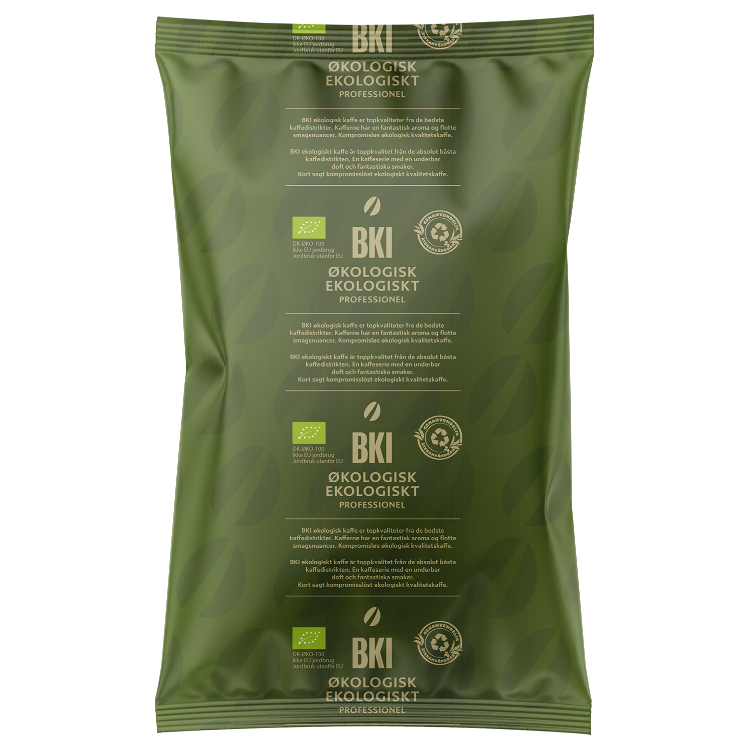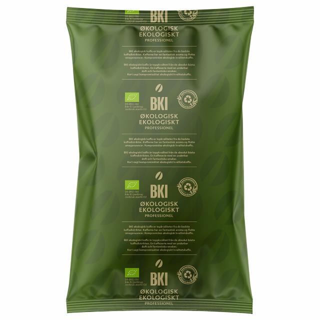 - BKI økologisk kaffe er topkvaliteter fra de bedste kaffedistrikter. Kaffen har en fantastisk aroma og flotte smagsnuancer. De økologiske kaffevarianter er det perfekte match i stempelkander, kandebryg og bryganlæg. Denne kaffe bliver leveret i Danmarks første genanvendelige kaffepose i plast, som efter brug kan blive til nye plastprodukter, når den sorteres som "blød plast".