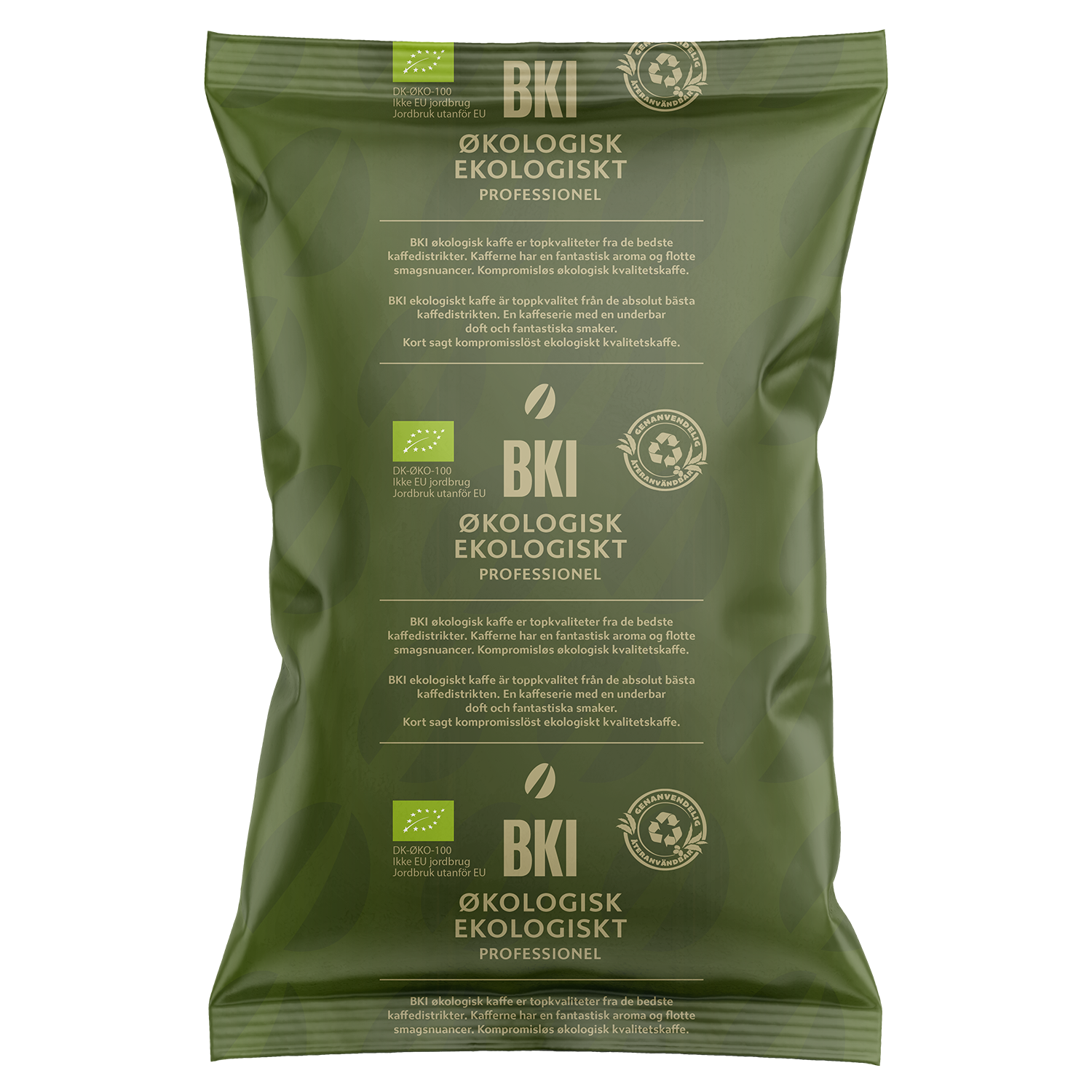 - BKI økologisk kaffe er topkvaliteter fra de bedste kaffedistrikter. Kaffen har en fantastisk aroma og flotte smagsnuancer. De økologiske kaffevarianter er det perfekte match i stempelkander, kandebryg og bryganlæg. Denne kaffe bliver leveret i Danmarks første genanvendelige kaffepose i plast, som efter brug kan blive til nye plastprodukter, når den sorteres som "blød plast".