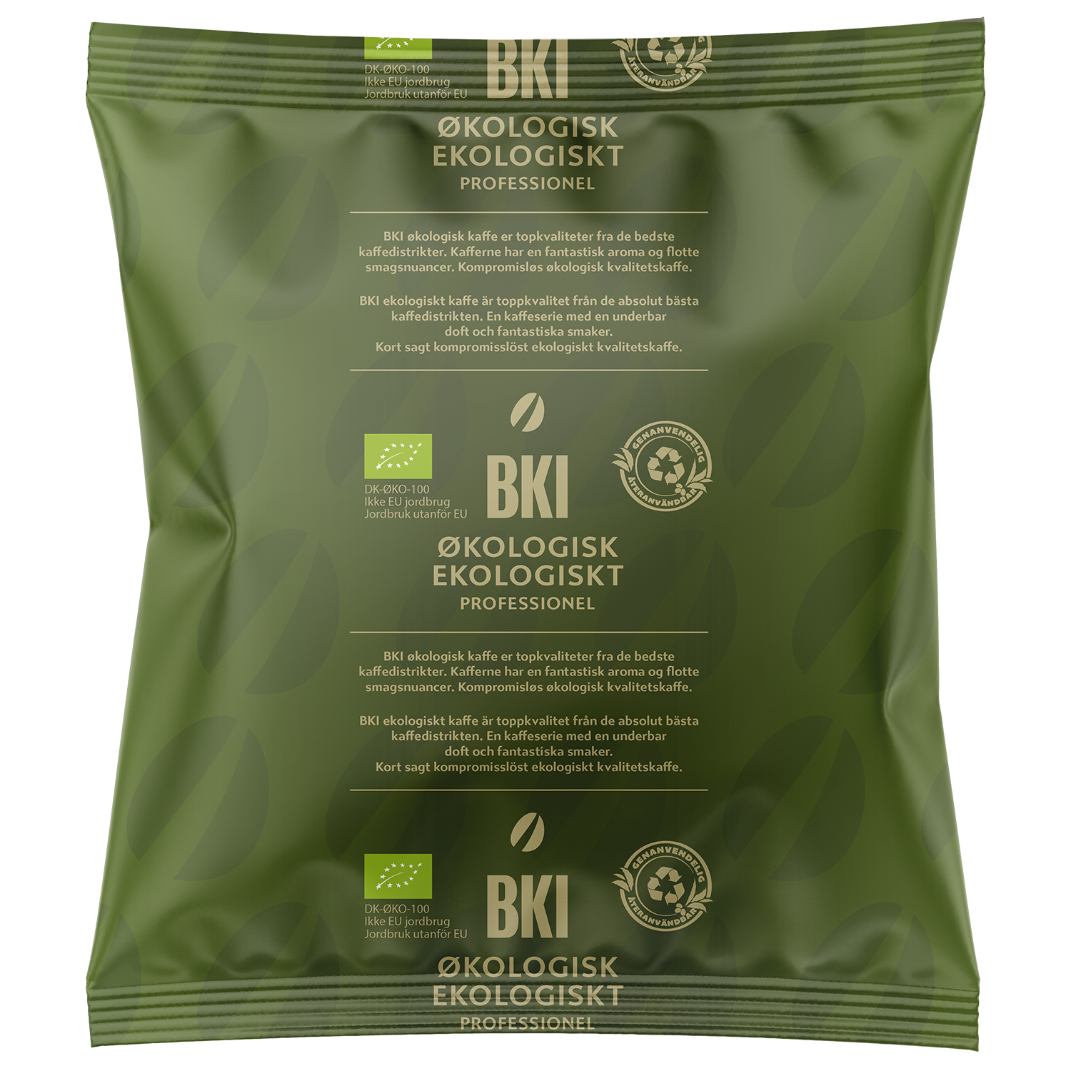 - BKI økologisk kaffe er topkvaliteter fra de bedste kaffedistrikter. Kaffen har en fantastisk aroma og flotte smagsnuancer. De økologiske kaffevarianter er det perfekte match i stempelkander, kandebryg og bryganlæg. Denne kaffe bliver leveret i Danmarks første genanvendelige kaffepose i plast, som efter brug kan blive til nye plastprodukter, når den sorteres som "blød plast".
