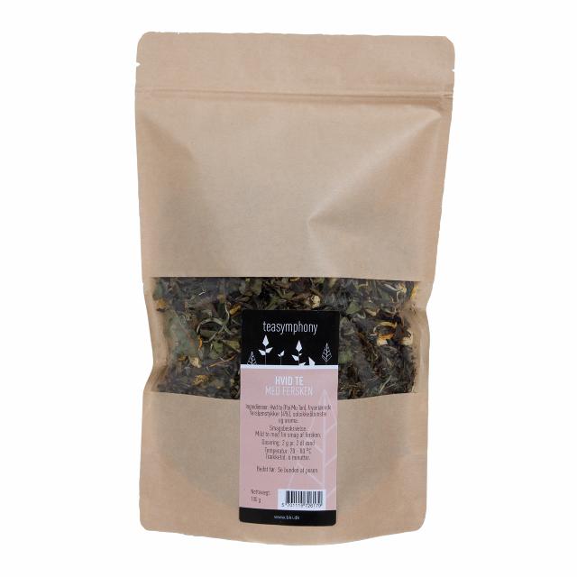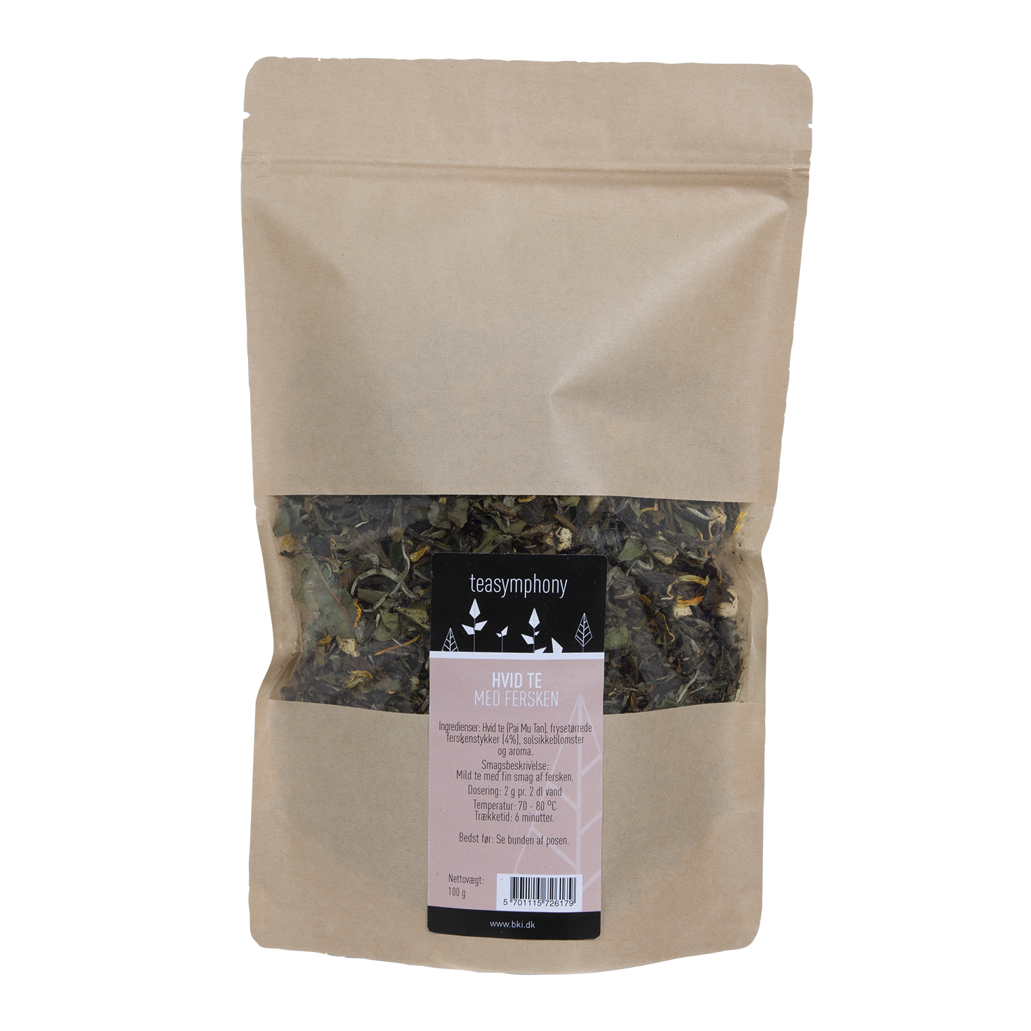 Hvid te (Pai Mu Tan), frysetørrede ferskenstykker (4%), solsikkeblomster og aroma.