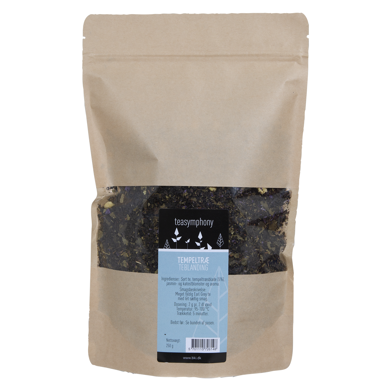 Sort te, tempeltræsblade (5%), katostblomster og aroma.