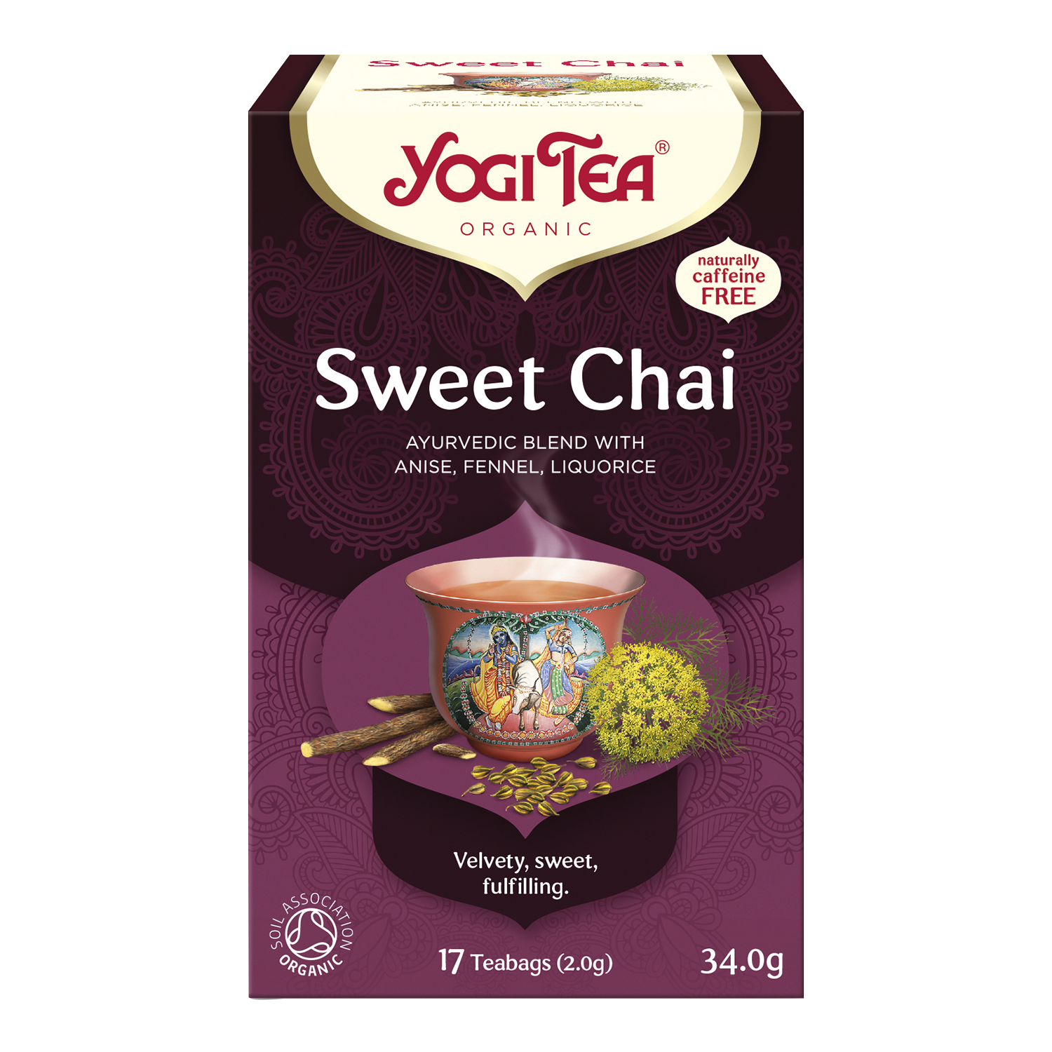 - Forelsk dig i den naturlige krydrede sødme i Yogi Tea Sweet Chai. Anis, fennikel, lakrids og nellike kombineret til en forførende, spændende smag. For at holde jordforbindelsen og kontakten med vores sjæl har vi brug for sødme i vores liv, da sødme repræsenterer jorden. Læn dig tilbage og nyd en naturligt sød kop Yogi Tea Sweet Chai. Essensen af denne te er: Rødderne.