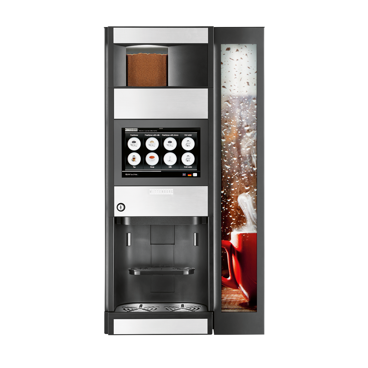 - Wittenborg er kendt for kvalitetsmaskiner i klassisk skandinavisk design. Et kendemærke for Wittenborg er mange års problemfri drift og muligheden for at tilpasse de forskellige drikke, så I får præcis den smag I ønsker. Wittenborg 9100 er fra den nyeste generation af kaffemaskiner, der bygger på den mest avancerede teknologi i et moderne design. Den yderst brugervenlige 10" touchskærm giver brugeren et hurtigt overblik over det store udvalg af varme drikke og guider nemt til det rigtige valg. Den nyudviklede Z4000 brygger giver mulighed for en god kop friskbrygget kaffe. Helt kort enkel betjening, moderne og energieffektiv teknologi, 1 bønnebeholder, mulighed for at brygge i kande samt mulighed for op til 4 instant beholdere.