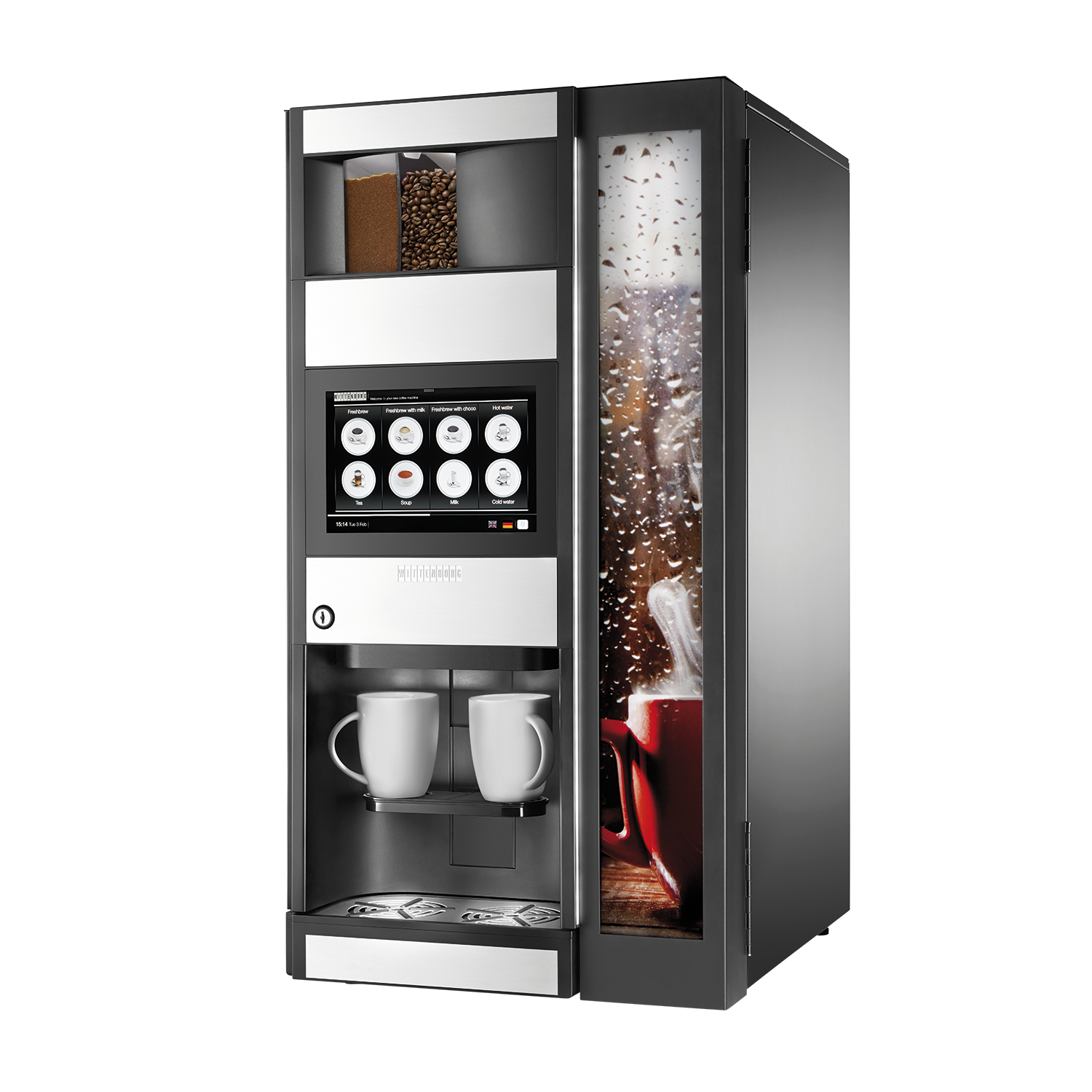 - Wittenborg er kendt for kvalitetsmaskiner i klassisk skandinavisk design. Et kendemærke for Wittenborg er mange års problemfri drift og muligheden for at tilpasse de forskellige drikke, så I får præcis den smag I ønsker. Wittenborg 9100 er fra den nyeste generation af kaffemaskiner, der bygger på den mest avancerede teknologi i et moderne design. Den yderst brugervenlige 10" touchskærm giver brugeren et hurtigt overblik over det store udvalg af varme drikke og guider nemt til det rigtige valg. Den nyudviklede Z4000 brygger giver mulighed for en kop friskbrygget kaffe og samtidig har man mulighed for at brygge den perfekte espresso. Helt kort enkel betjening, moderne og energieffektiv teknologi, store bønnebeholdere med kapacitet op til 2,1 kg kaffe i hver, mulighed for at brygge i kande samt mulighed for op til 4 instant beholdere.