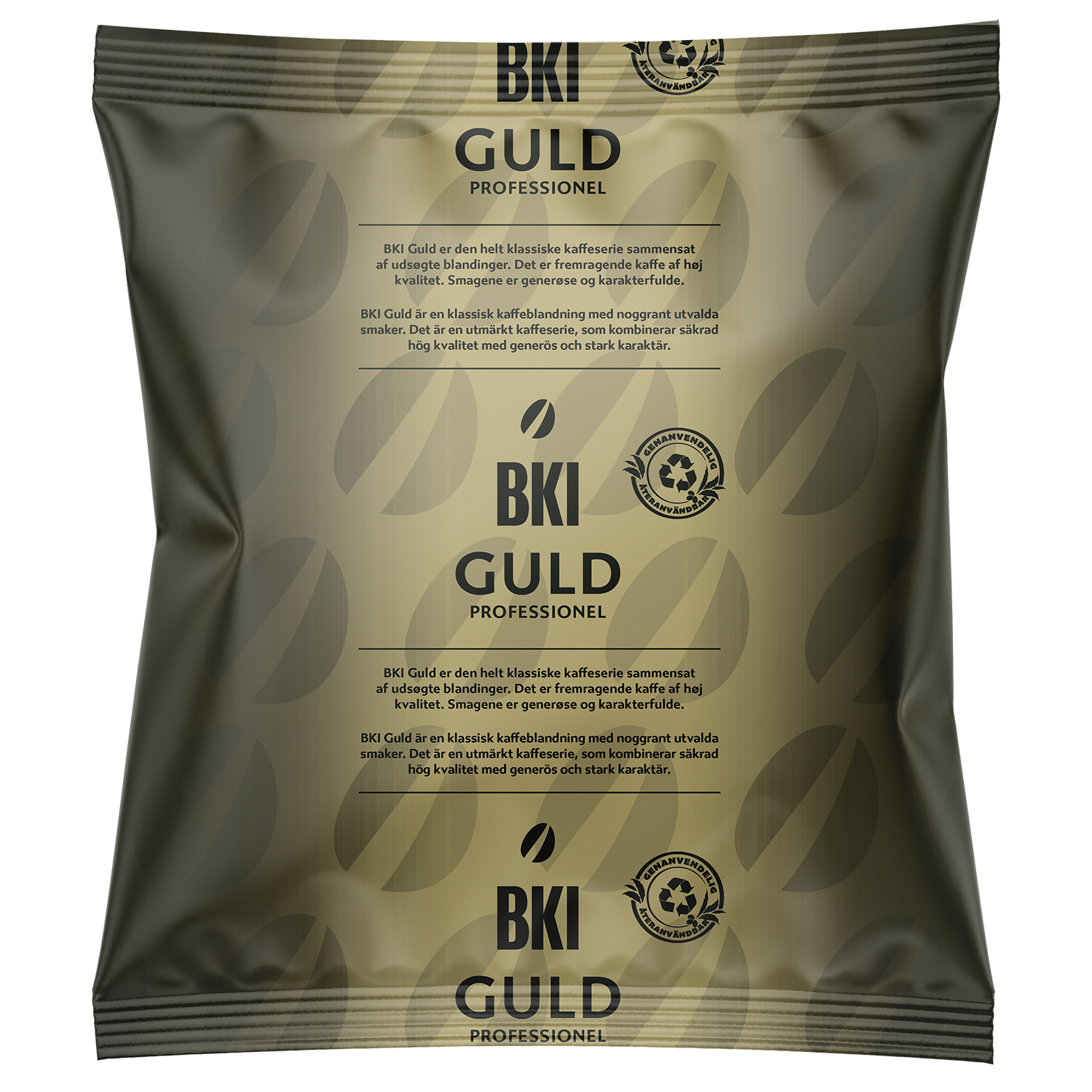 - BKI Guld er den klassiske kaffeserie, som består af nogle af de mest solgte kaffevarianter på det danske professionelle marked. Det, der kendetegner BKI Guld kaffen, er, at den er mellem- eller mørkristet, mild og rund. Serien er sammensat af kaffe fra blandt andet Sydamerika og Indonesien. Resultatet er kaffe med en rund og fyldig smag med en behagelig let syrlig eftersmag. BKI Guld-serien er særdeles velegnet til kandebryg og automater. Denne kaffe bliver leveret i Danmarks første genanvendelige kaffepose i plast, som efter brug kan blive til nye plastprodukter, når den sorteres som "blød plast".