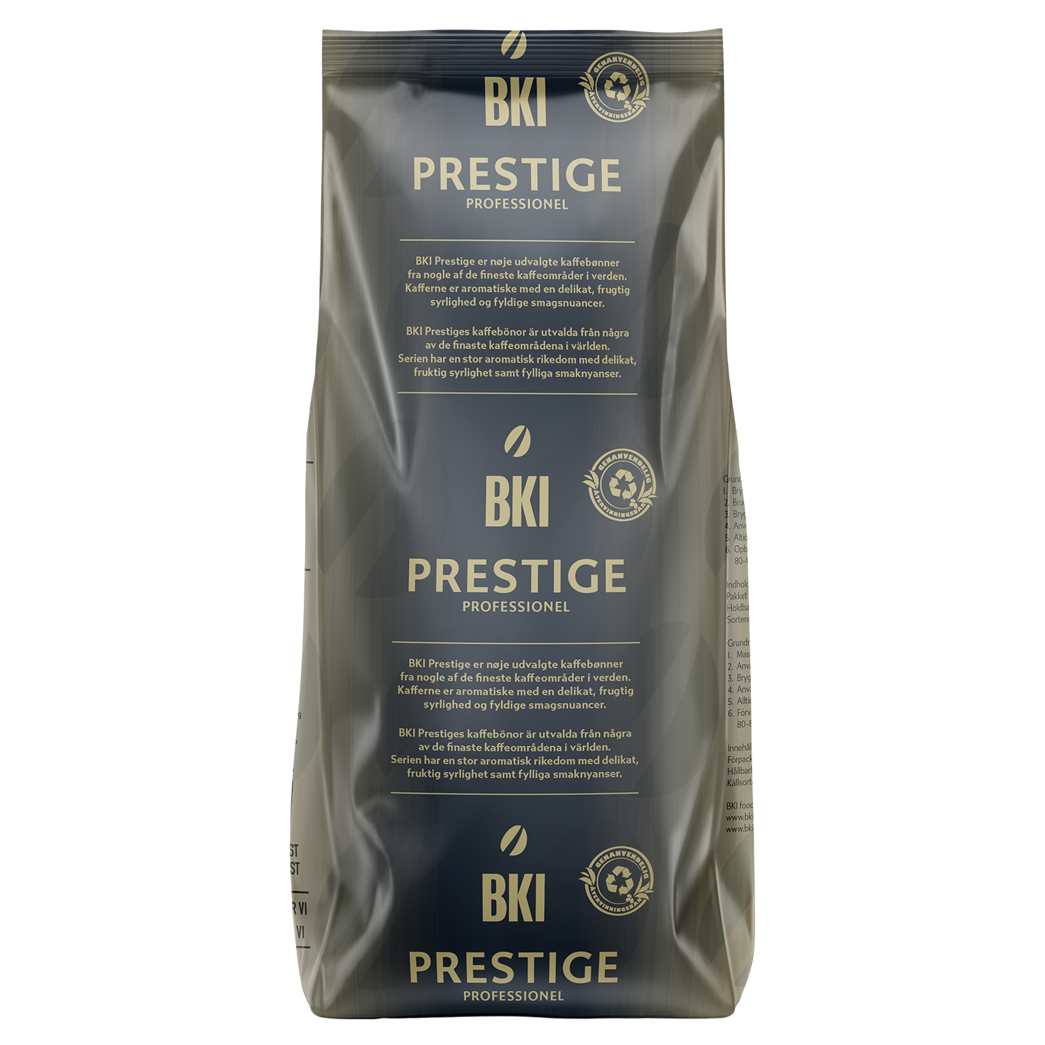 - BKI Prestige kaffeserien består af kaffe af specielt udvalgte kaffebønner af høj kvalitet. Disse kommer fra nogle af verdens allerbedste kaffeområder – Colombia, Brasilien og Indonesien. Prestige-kaffe har vi valgt at lys- eller mellemriste for at bevare flest mulige af de fine og naturlige æteriske olier i kaffen – og bevare fylden og den udsøgte syrlighed. Med Prestige-kaffe får du frugtagtig og mild gourmetkaffe, der er harmonisk og intens - med stor personlighed. Prestige-kaffe er det perfekte match til stempelkander, kandebryg og bryganlæg. Denne kaffe bliver leveret i Danmarks første genanvendelige kaffepose i plast, som efter brug kan blive til nye plastprodukter, når den sorteres som "blød plast".