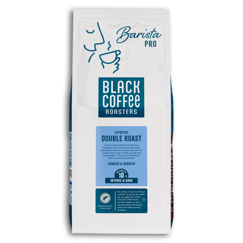 - Erstatter 40410100 Black Coffee Roasters PRO Double Roast RFA Espresso 1 kg hele bønner - Samme smag! En ekstra mørkristet og lækker espresso med noter af mørk chokolade og ristet røget smag, en tyk crema og fyldig aroma i hver kop. Den kan måske lige få dig på benene – om ikke af energi, så af ren begejstring! Rainforest Alliance: Når du vælger kaffe med Rainforest Alliance-certificering, støtter du en bedre fremtid for kaffebønder og deres familier – og en dyrkning, der har respekt for naturen og forbedrer farmernes arbejdsvilkår