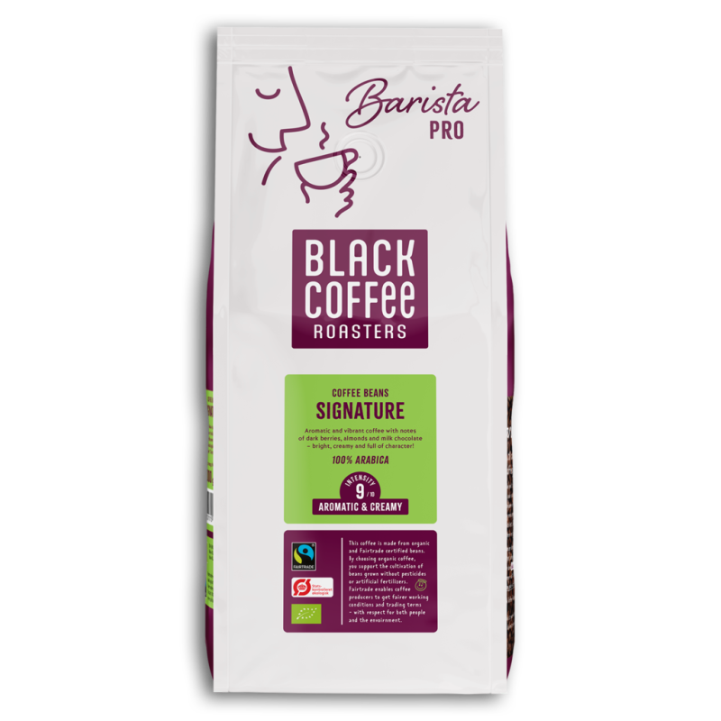 - Erstatter 40410320 Black Coffee Roasters Org./Fair 1 kg Krav Hele Bønner - Samme smag! Aromatisk og livlig kaffe med noter af mørke bær, mandler og mælkechokolade – lys, cremet og fuld af karakter! 100% Arabica. Signature serien – Økologisk og Fairtrade certificeret kaffe: Disse kaffer er lavet på kaffebønner, der er både økologiske og Fairtrade-certificerede. Når du vælger økologisk kaffe, støtter du en produktion uden pesticider og kunstgødning. Fairtrade er med til at sikre ordentlige arbejdsvilkår og fair aftaler for bønderne.