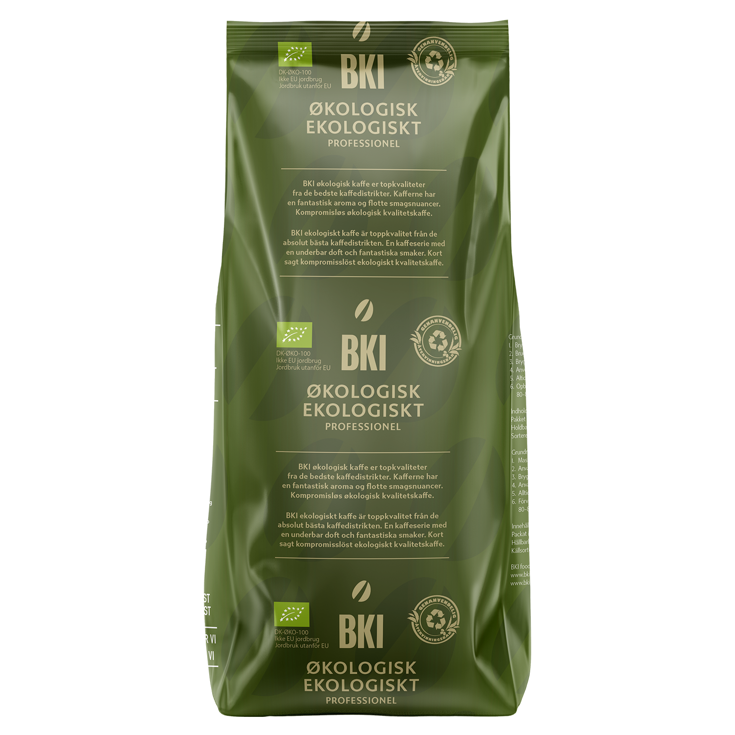 - BKI økologisk kaffe er topkvaliteter fra de bedste kaffedistrikter. Kaffen har en fantastisk aroma og flotte smagsnuancer. De økologiske kaffevarianter er det perfekte match i stempelkander, kandebryg og bryganlæg. Denne kaffe bliver leveret i Danmarks første genanvendelige kaffepose i plast, som efter brug kan blive til nye plastprodukter, når den sorteres som "blød plast".