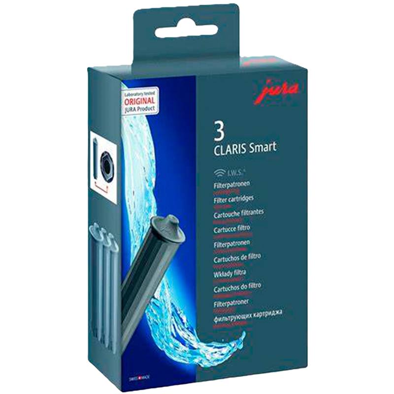 - JURA Claris Smart er de nye vandfiltre fra JURA, hvor der sidder der en chip i, så maskinen får følgende features: Så snart der sættes et filter i vandtanken, registrerer maskinen selv, at den kører med filter. De nye filtre skylles automatisk igennem, når filteret indsættes. Når filteret har opbrugt sin kapacitet, kan det ikke bruges mere, og maskinen melder "change filter" Skiftes filteret ikke, når maskinen beder om det, vil maskinen bede om at blive afkalket. Tages filteret ud af vandtanken, vil maskinen fremover bede om at blive afkalket i stedet for at få skiftet filter. Filterets chip registrerer altså, om der sidder et filter i vandtanken eller ej. Maskinen KAN ikke afkalkes med filteret i vandtanken. Ved maskinens opstart skal vandets hårdhed indtastes. Herefter udregner maskinen kapaciteten på filteret som er mellem 80 og 300 liter afhængig af vandet hårdhed. I Danmark vil det typisk ligge på 80 - 150 liter. OBS. Filteret virker KUN til JURA WE6, WE8, X6 og X8.